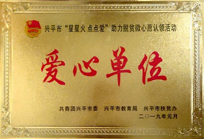 2019年1月,在興平市“星星火,點(diǎn)點(diǎn)愛”助力脫貧微心愿認(rèn)領(lǐng)活動(dòng)中,寶塔山漆被共青團(tuán)興平市委、興平市教育局、興平市扶貧辦評為“愛心單位”