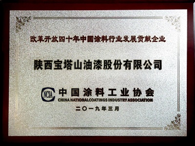 2019年3月,寶塔山漆被中國涂料工業(yè)協(xié)會(huì)評為“改革開放四十周年中國涂料行業(yè)發(fā)展貢獻(xiàn)企業(yè)”