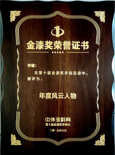2019年6月,寶塔山漆李斌同志在中外涂料網(wǎng)第十屆金漆獎(jiǎng)評選活動(dòng)中被評為“年度風(fēng)云人物”