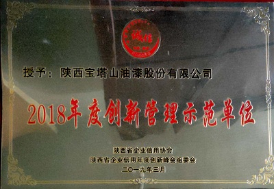 2018年3月,寶塔山漆被陜西省企業(yè)信用協(xié)會(huì)與陜西省企業(yè)信用年度創(chuàng)新峰會(huì)組委會(huì)評為“2018年度創(chuàng)新管理示范單位”